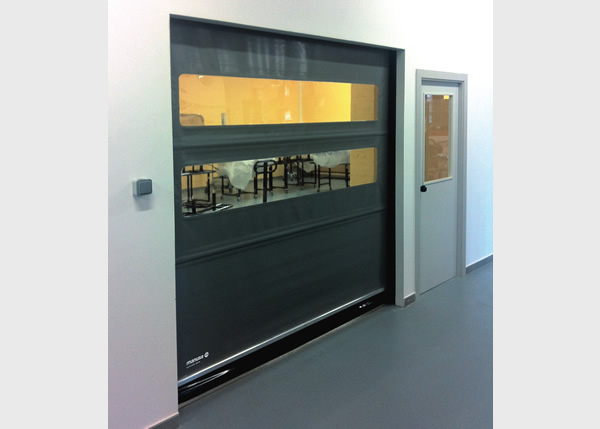 High-speed roll-up door for clean roomsDoor for clean rooms conceived to offer superior air-tightness in the partitioned zone and with an optimised design to maximise the necessary hygiene standards in this type of environments. Main features